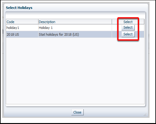 - Use the Select buttons to add holidays to the location and repeat these steps until all applicable holidays have been added.